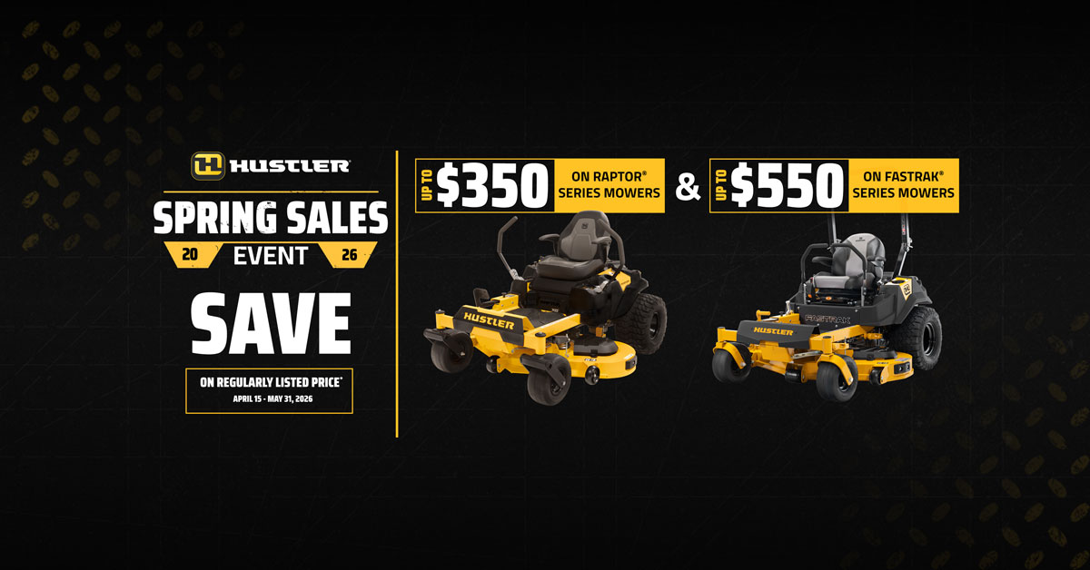 *Offer applies to purchase of Raptor & Fastrak Series only, at participating US Dealers only. Offer valid 4/15/26- 5/31/26, or while quantities last. Cannot be combined with any other discount or promotions.If you return the merchandise, the value of this promotion is not refunded or credited to your account. Does not apply to prior or future purchases. No cash value, except where prohibited. Promotion is subject to change. Other restrictions may apply. See web.hustlerturf.com/springsales event for complete offer details.